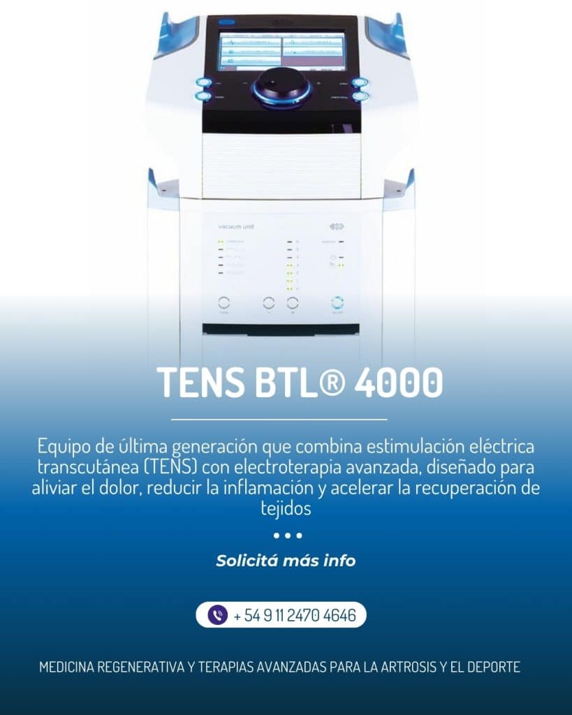 In Stem Cell Therapy Argentina, continuamos liderando el camino en la medicina regenerativa, y hoy estamos emocionados de anunciar la incorporación del avanzado sistema TENS BTL 4000 PREMIUM, combinado con electroterapia y el innovador módulo de ultrasonido HandsFree Sono®. Esta tecnología de vanguardia, una de las más exclusivas en Argentina, refuerza nuestra posición como el centro de rehabilitación regenerativa más avanzado del país, potenciando tratamientos como el PRP Hiperconcentrado® y las Células Madre Mesenquimales de Tejido Adiposo con la ténica Microfat® y AlliaCells®.